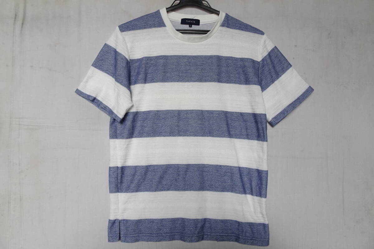 > TAKA:Q/タカキュー/半袖Tシャツ/カットソー/極太ボーダー柄/ヘリンボーン織/ボーダー織/青/ブルー/白/ホワイト/Mサイズ(9/3R)