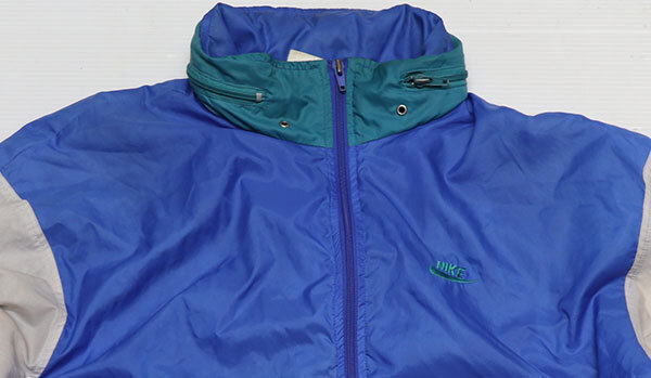 > NJ72ナイキNIKEアメリカ古着ナイロンジャケット90’Sビンテージ旧タグ切り替えパーカー付きLビッグサイズ青系x白系x緑系オールド&レトロ