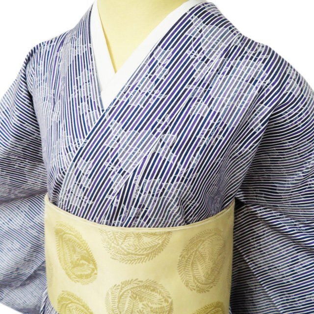 - 播包 播州織 着物 新品 木綿 単衣 カジュアル 縞模様 花柄 黒色 紫色 紺色 身丈172cm 裄69cm L トール きもの北條 A1086-5