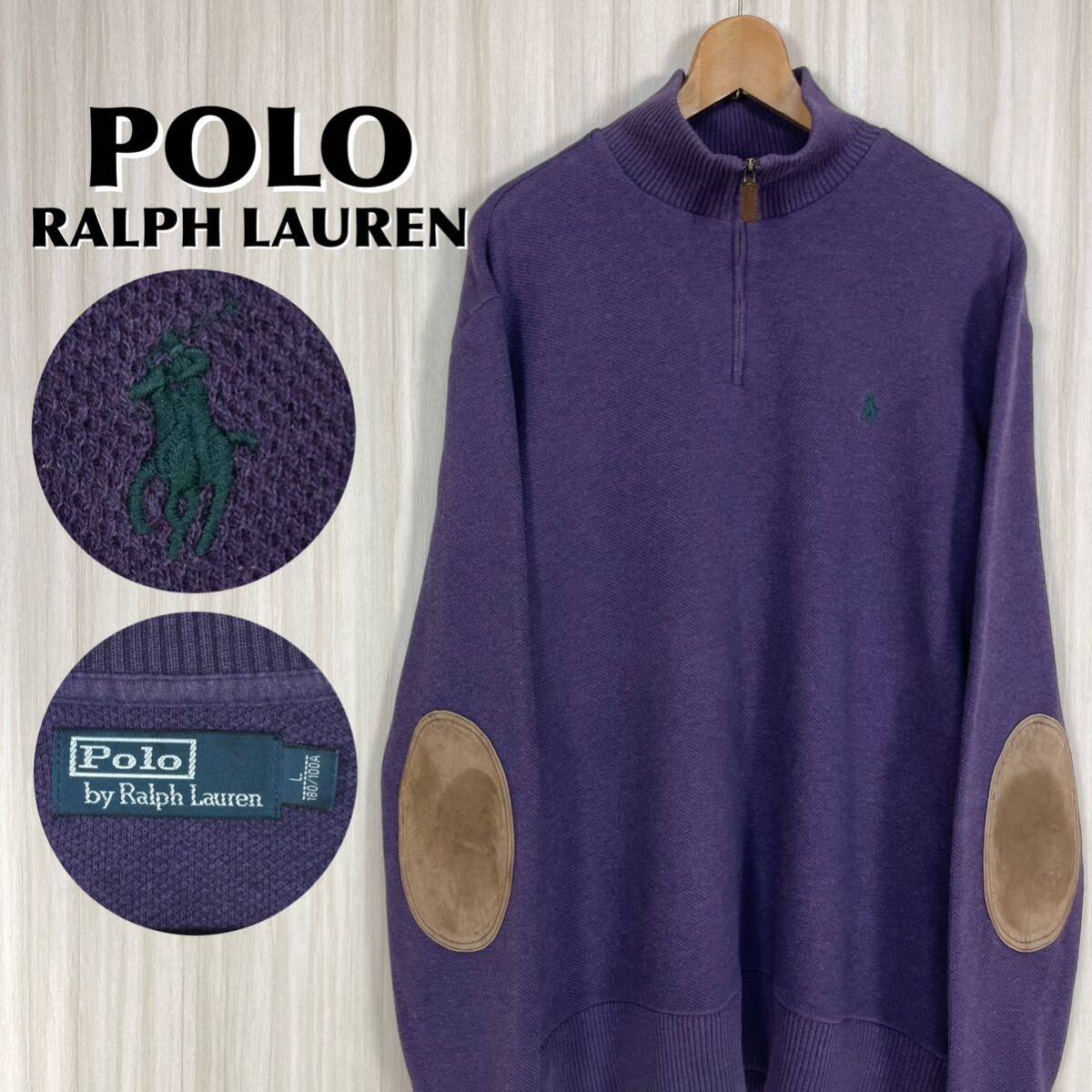 > ☆入手困難☆POLO ポロバイラルローレン 刺繍ポニー エルボーパッド レザーパッチ ハーフジップ コットンニット L 紫 パープル 90s 古着