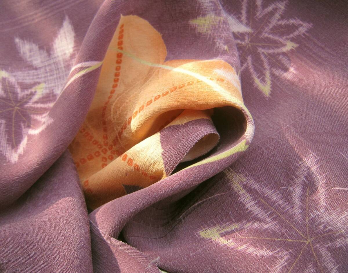 ■古い生地です。アンティークな味わいの良い風合いです。古代紫に渋めの橙の紅葉。地紋は七宝柄、紗綾型が織られています。