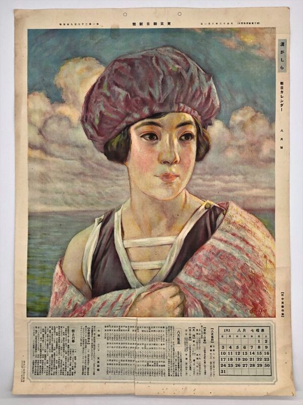 - 【蔵出し印刷物集】 田中良 画伯 筆 「浪がしら」 東京朝日新聞社 カレンダー8月号 大正13年発行 M0305B