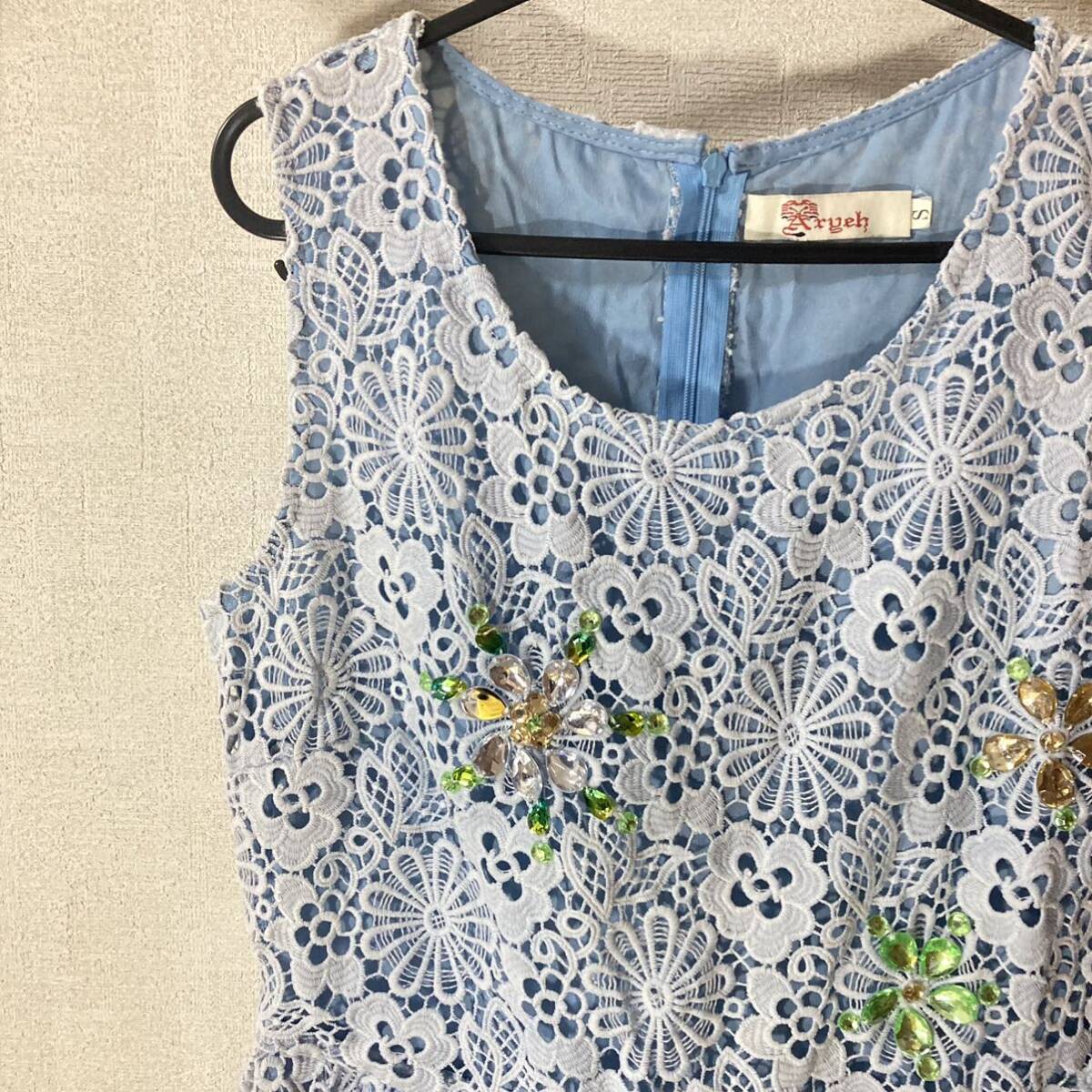 - ワンピース ノースリーブ ドレス 水色 キラキラ 花柄 シースルー レース ひざ丈 大人 可愛い セクシー