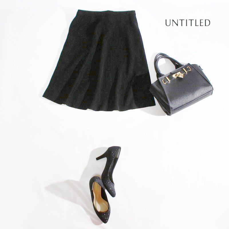 - 美品 アンタイトル UNTITLED 株) ワールド 合物 ストレッチ ジャージ― スーツ フレアスカート 1 S ブラック 黒 フォーマル 綺麗め 上品