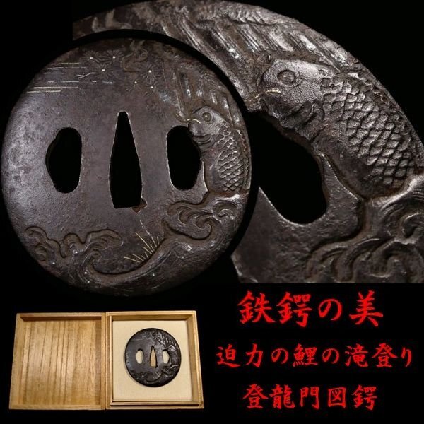 > 【 恵 #1343 】 鉄鍔の美 見事な彫りの鯉の滝登り(登龍門)図 鉄地鍔 金銀象嵌 検:鍔/縁頭/切羽/ハバキ/刀剣/刀装具