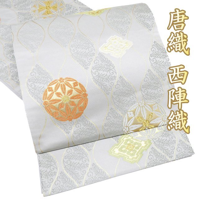 - 袋帯 中古 リサイクル 正絹 仕立て上がり 六通 西陣織 ラベル付き 唐織 松立涌文 竹と桜 箔糸 薄灰色 多色 金 きもの北條 A1091-19