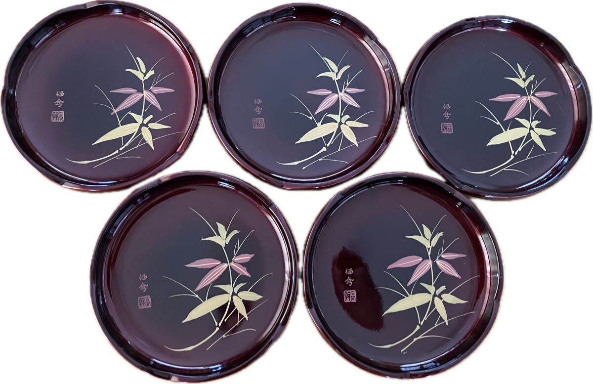 - [幹高]特撰会津塗り 漆器 蒔絵螺鈿 梅型 竹笹 銘々皿 菓子皿 5客セット