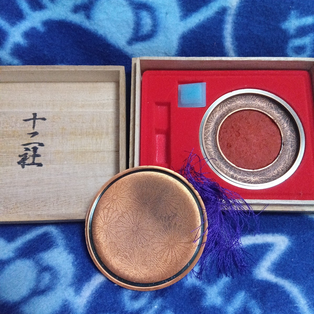 - 趣のある朱肉入れ 銅製 鯉の図柄 桐箱入り