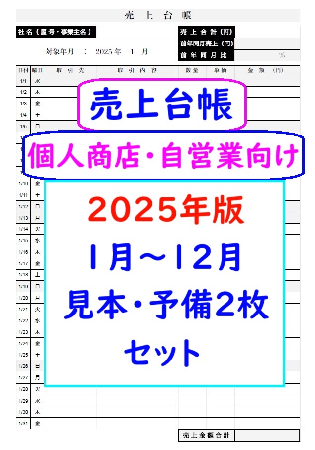 - 即決【2025年版】売上台帳 個人商店・自営業向け 見本・予備2枚 セット 売上帳 売上管理表 帳簿 支援金 助成金 補助金