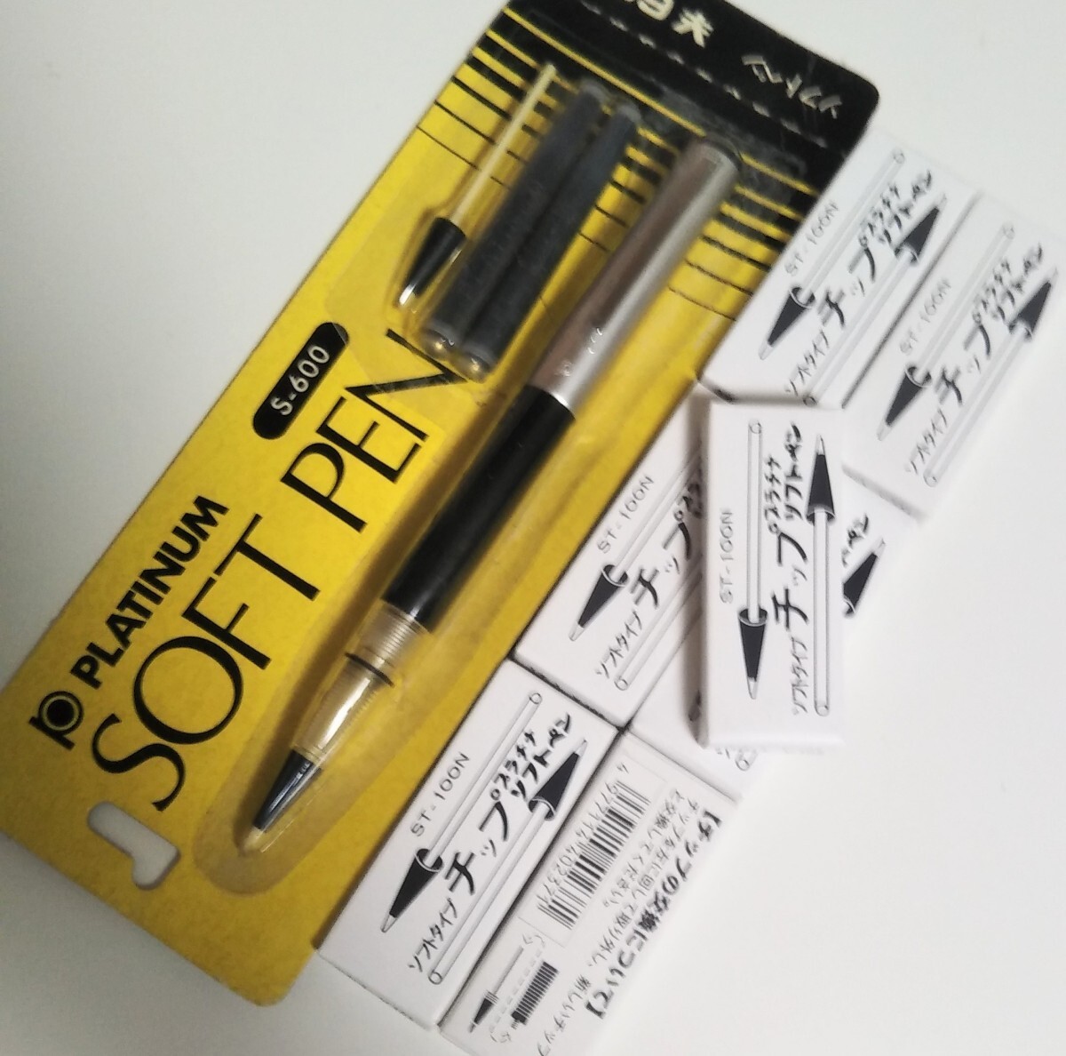 - 希少 昭和レトロ 廃番 PLATINUM プラチナ万年筆 ソフトペン S-600 黒 未開封 未使用 長期保管 チップ7箱21本付き