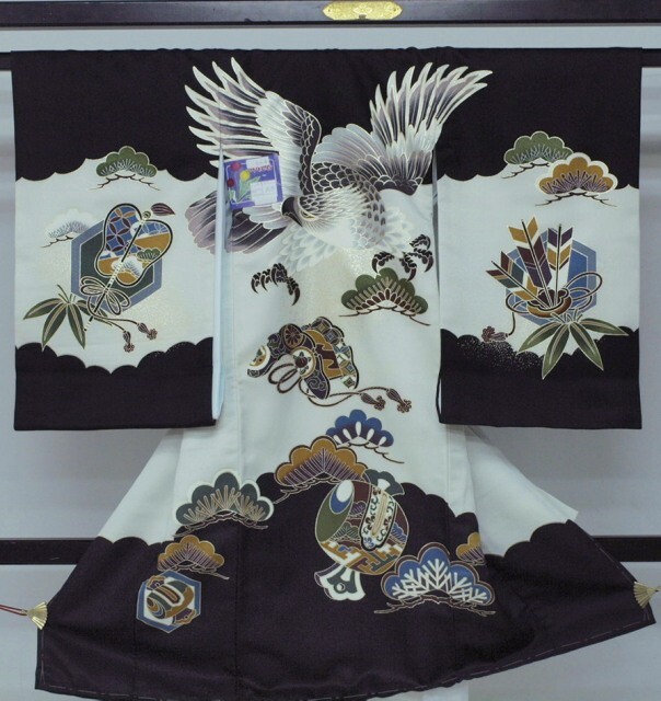 - 新品 0003 お宮参り祝い着 男の子用熨斗目 黒/薄グレー 鷹柄