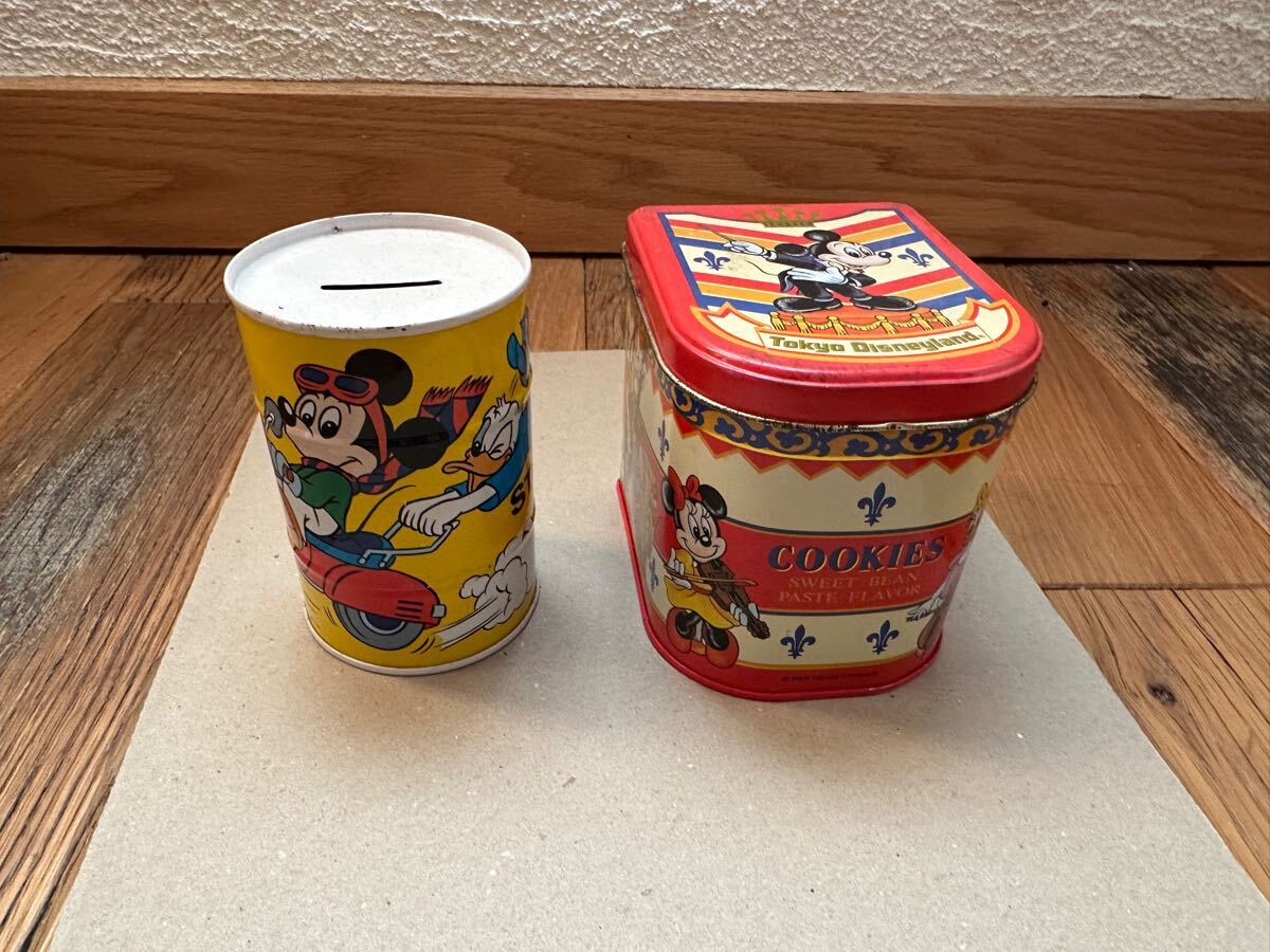 - 送料込み 中古 古い ディズニー 丸型 缶 貯金箱 おまけ付き ミッキー ドナルドダック ニチテン 、 Disney NICHITEN ヴィンテージ レトロ