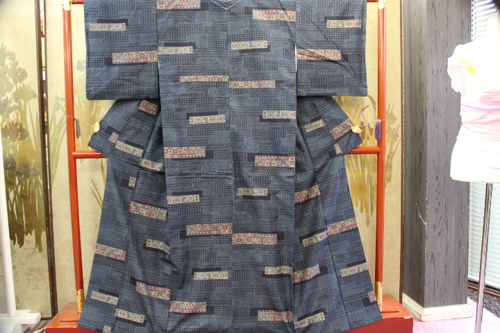 - きもの今昔7673 紬のきもの 袷広衿手縫い仕立きもの 正絹十日町紬地黒地に紺蚊絣大島調横角柄 身丈162cm
