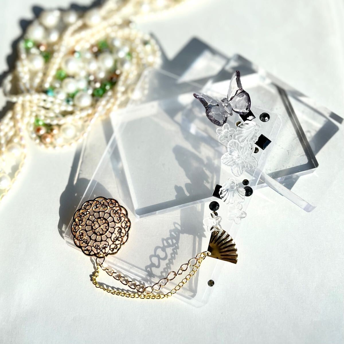 - トレカケースデコ B8 硬質ケースデコ 花 ゴールド 蝶 扇子 クリア チェーン 黒 ビジュー ブラック ラインストーン カードケースデコ 推し活