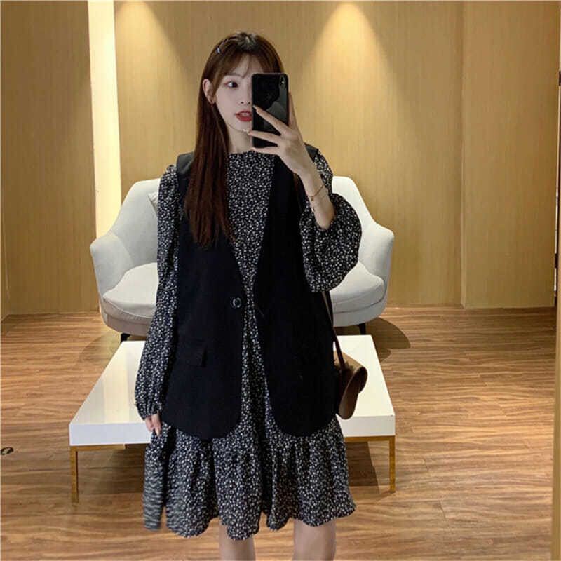 - レディース セットアップ ワンピース+ベスト 2点セット 総柄ワンピース 春秋 長袖 ゆったり かわいい 大きいサイズ LSFA051(M-4XL)