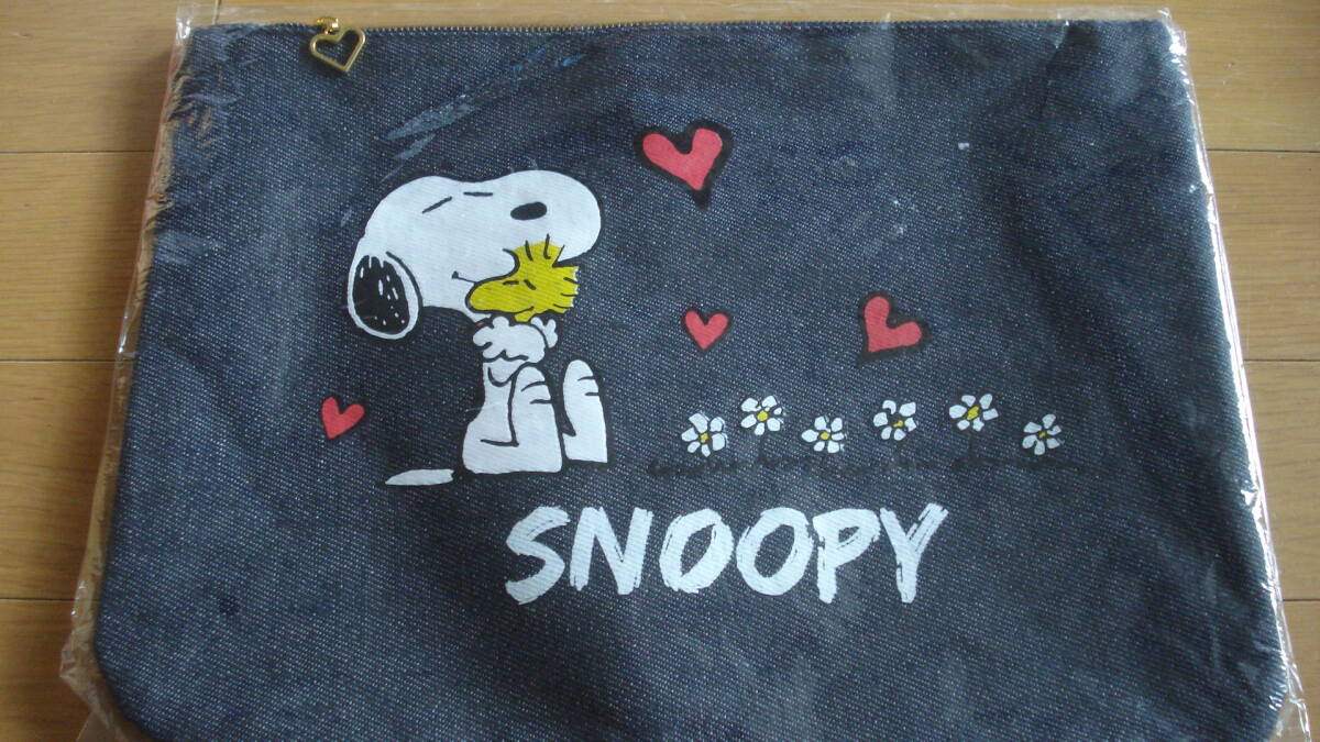- スヌーピー デニム風ポーチ//約 縦24.5㎝×横 32.5㎝// ピーナッツ //SNOOPY//クラッチバッグ・バッグインバッグ