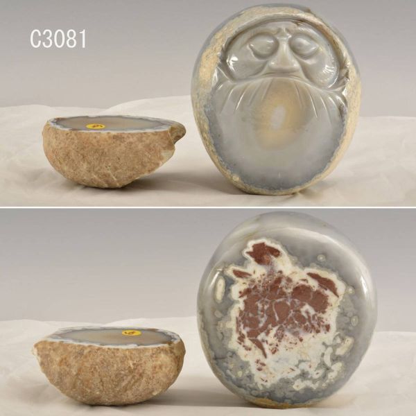 - C03081 メノウ製 ダルマと磨いた原石1 計2点:真作