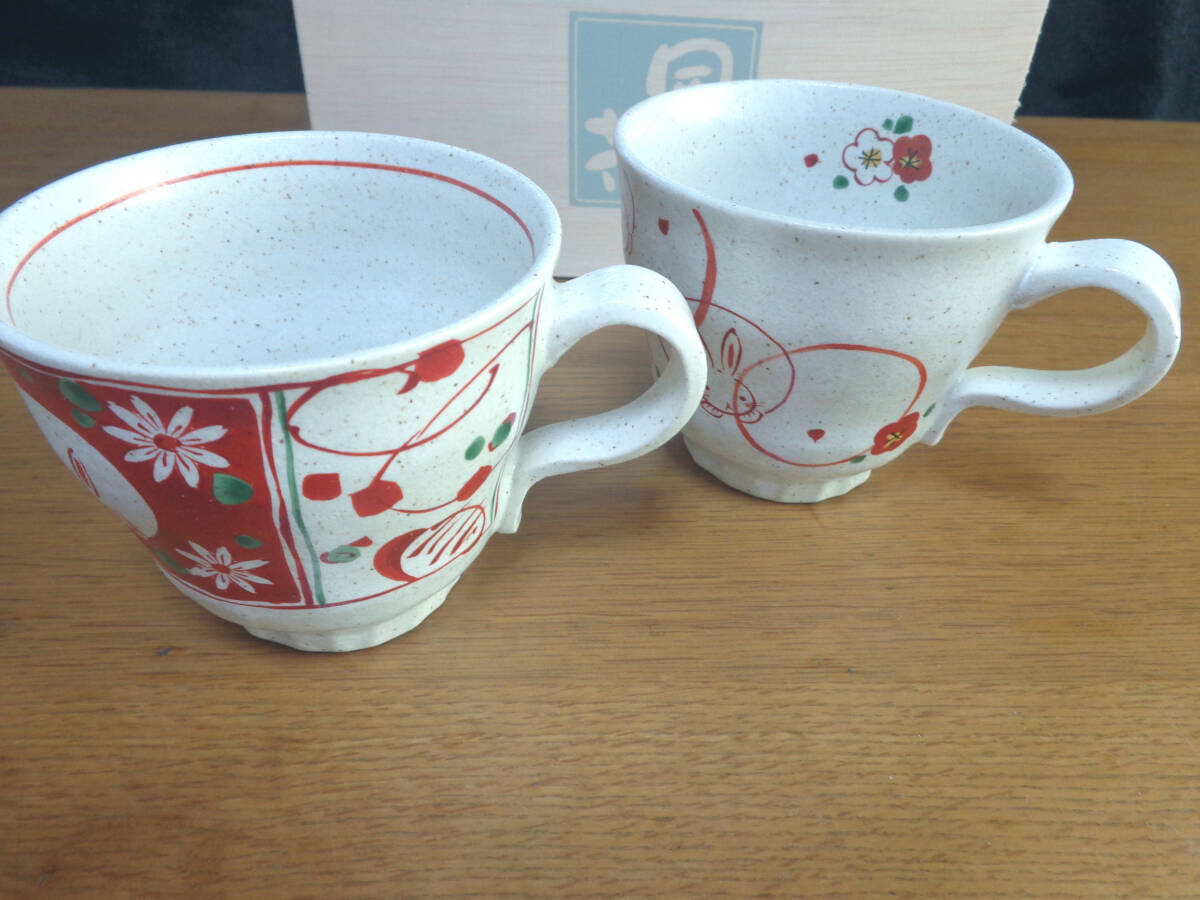 - 美濃焼★赤絵★花うさぎ★ペアマグカップ★大きい★可愛い★箱入未使用