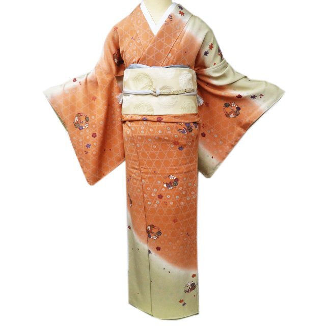 - 訪問着 着物 未使用 正絹 袷 花と蝶の図 籠目模様 暈し 縮緬地 東雲色 木蘭色 多色 金 身丈161cm 裄67.5cm M きもの北條 A1101-9