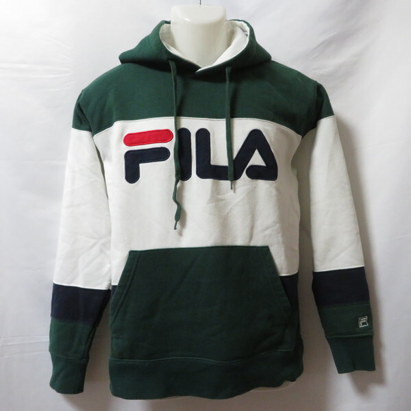 > 古着 メンズL FILA/フィラ 裏起毛 スウェットパーカー フーディ プルオーバー スポーツ カジュアル グリーン/ホワイト FH7438