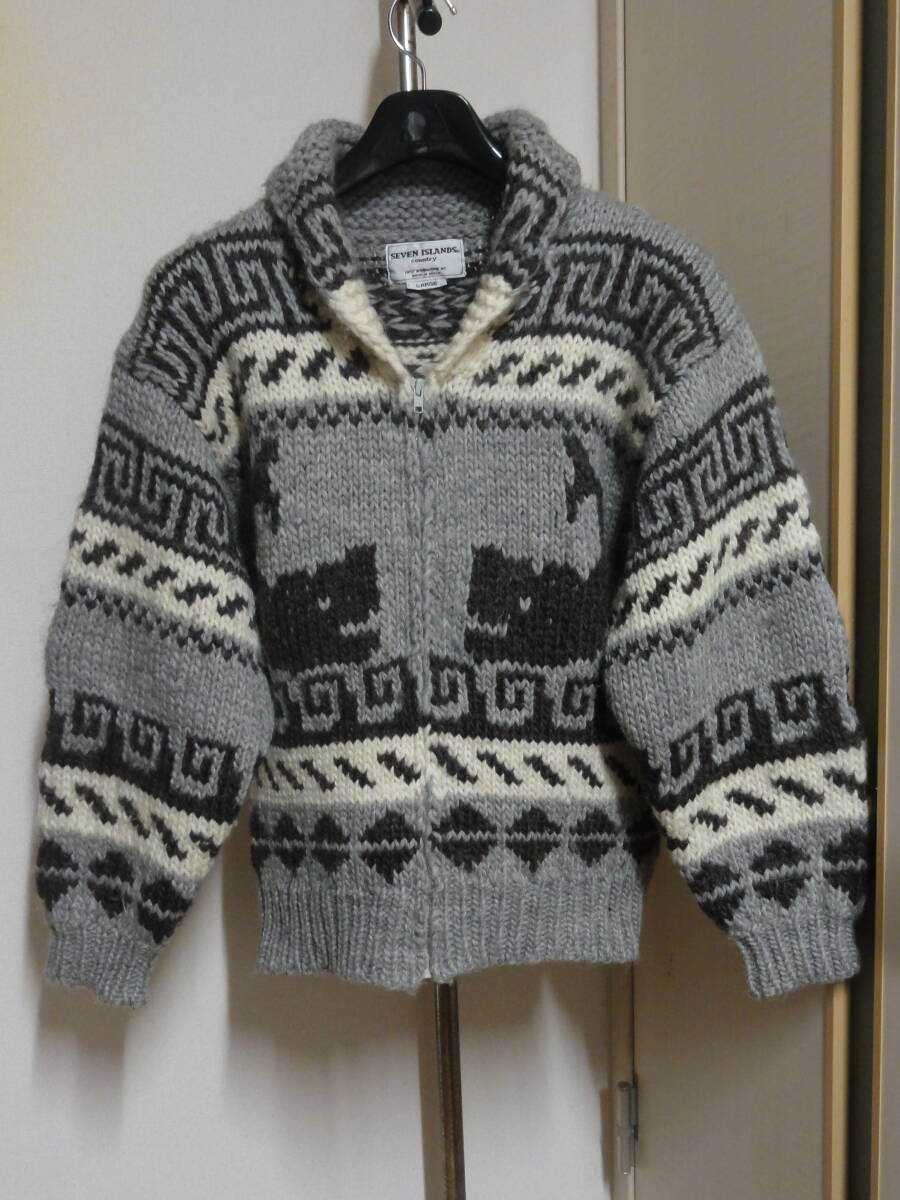 - 格安ウール100%高級モデル・SEVEN ISLANDS・グレー系主体地・鯨(ホエール)?ネイチャー&ネイティブ系織柄入り・重厚カウチン系ブルゾン L