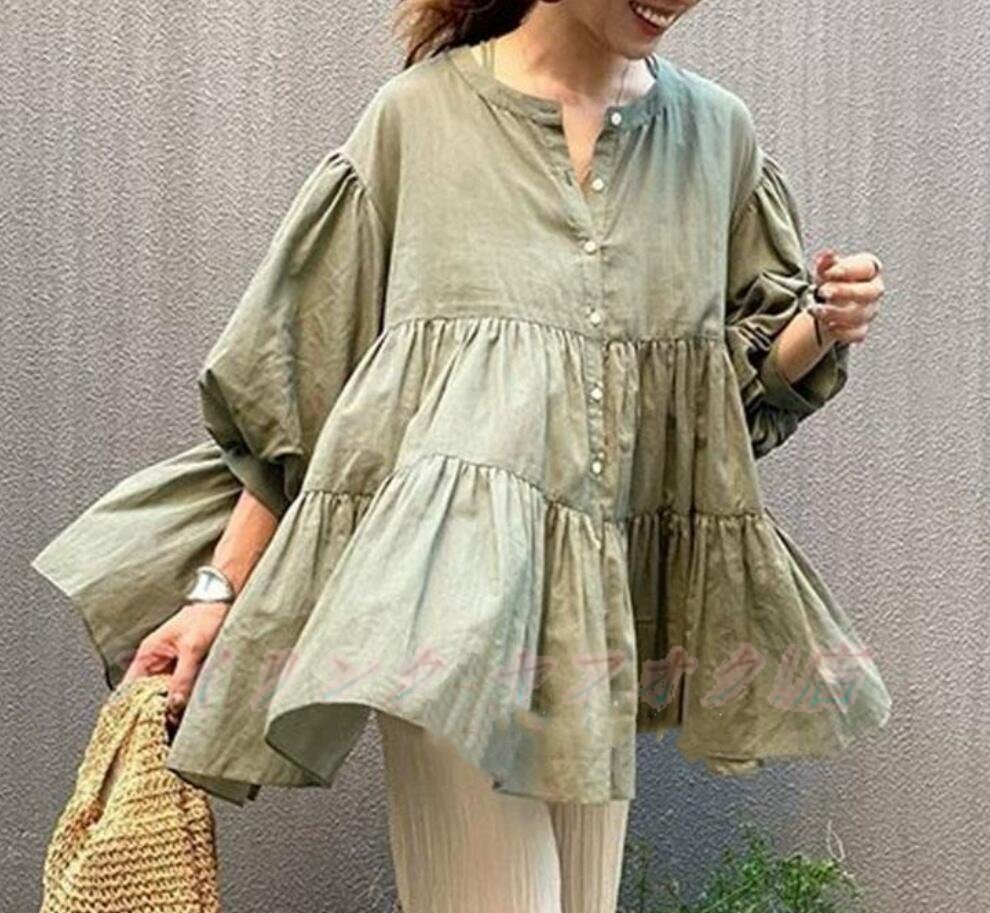 - ☆新品ゆったり フレア ブラウス 半袖 オーバーサイズ レディース チュニック きれいめ オフィス 無地 トップス グリーン