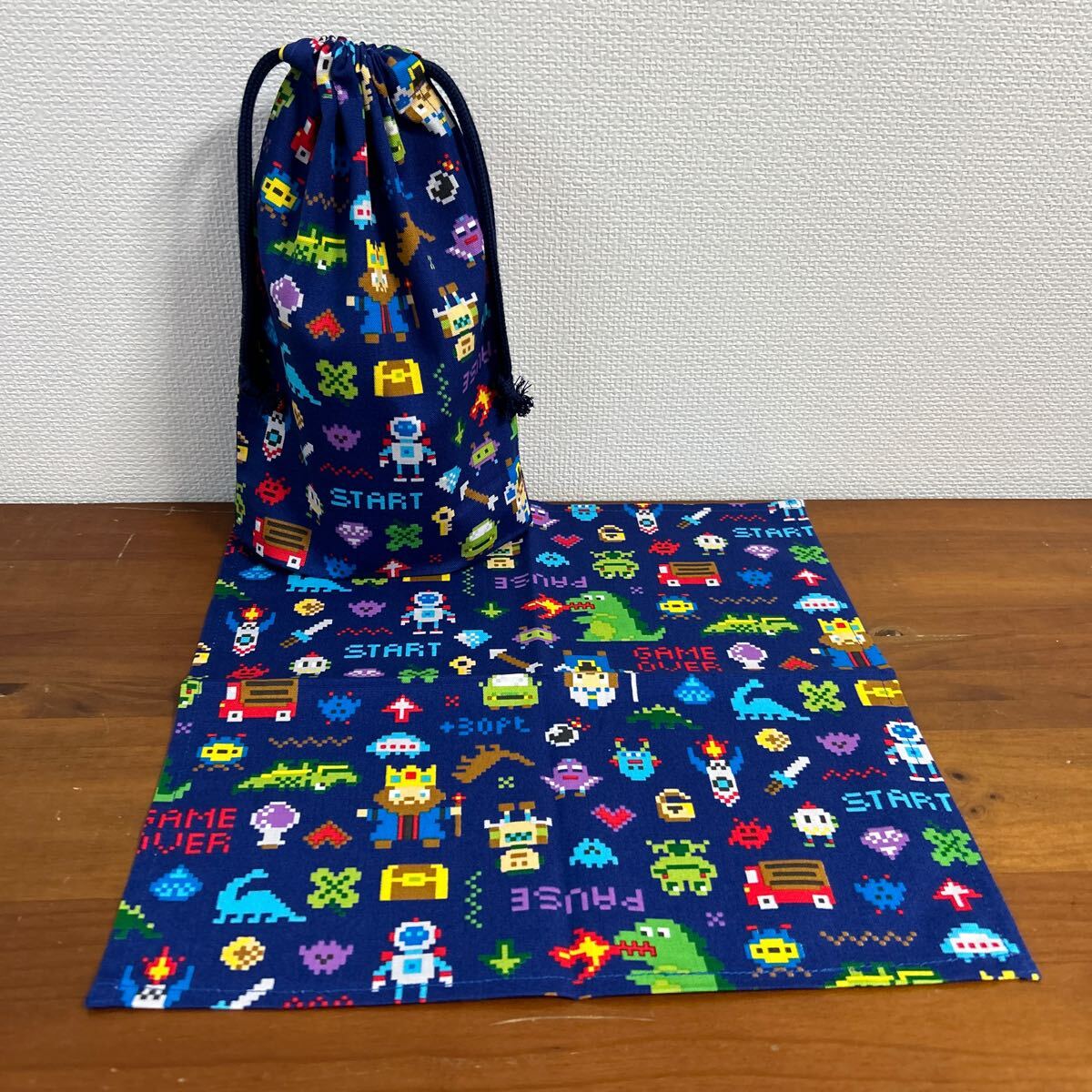 - ハンドメイド 30×30cmサイズのフキン&給食袋セット NO.32 給食袋 巾着袋 ランチョンマット入園入学準備
