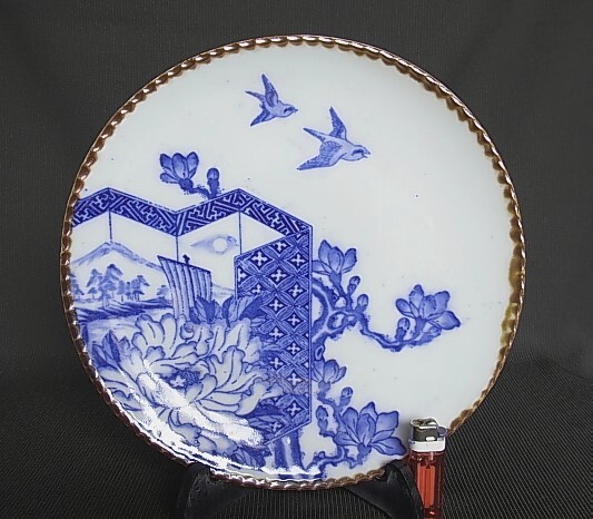 - 【C1003】イゲ皿 29.5㎝ 印判 明治 花鳥 屏風 山水画
