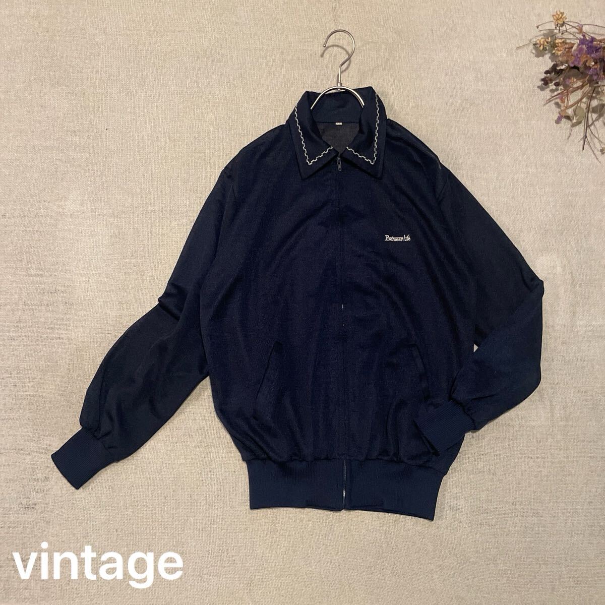 - 古着 長袖シャツ カットソー シースルー ネイビー Mサイズ 美品 ヴィンテージ 襟刺繍 ブルゾン USED ジャージジャケット