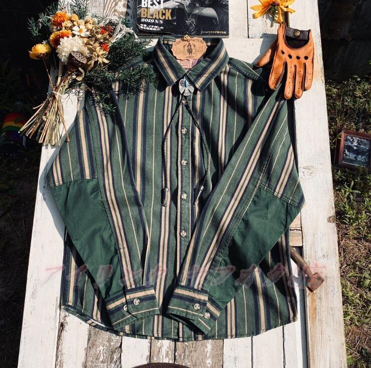 > ☆新品ヴィンテージ かっこいい ボーダー ストライプ柄 コットン100% 長袖 ダンガリーシャツ アメカジ M~2XL グリーン