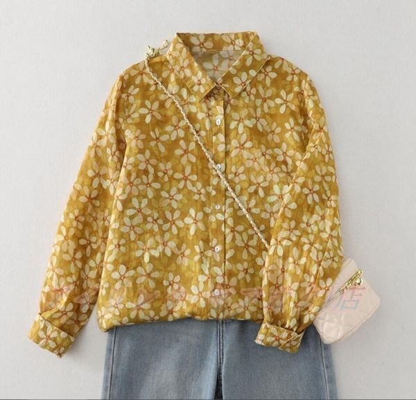 > ☆新品サイズ選択可 ナチュラル ブラウス 花柄シャツ 通勤 前開き かわいいキレイめ トップス 長袖シャツ お出かけ イエロー
