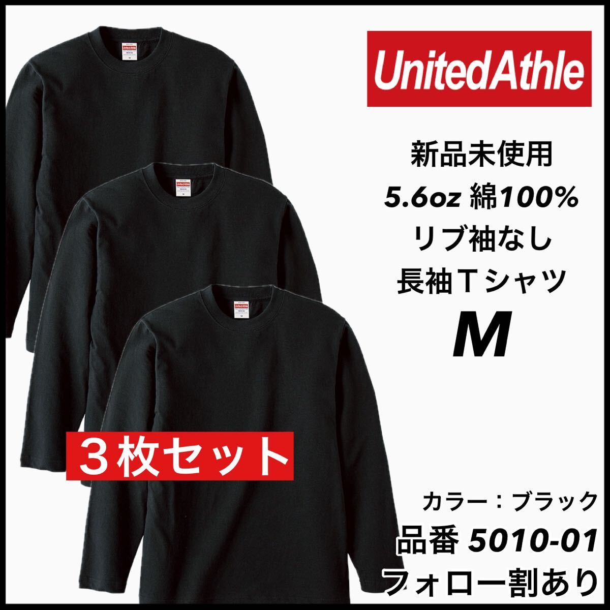 > 新品未使用 ユナイテッドアスレ United Athle 5.6oz 無地 袖リブなし 長袖Tシャツ ロンT 黒 ブラック3枚セット Mサイズ ユニセックス