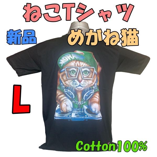 - 猫 Tシャツ (めがね ねこ L) おもしろ キャット アニマル シャツ