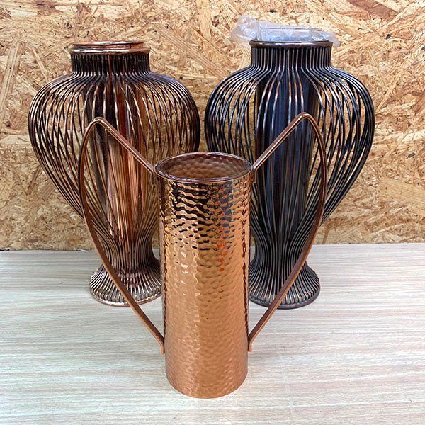 - 送料無料◆ 銅仕上げ 花瓶★花籠 レトロフラワーベース 3点セット 花器 花入れ 花かご 金属工芸 アンティーク コレクション 中古品
