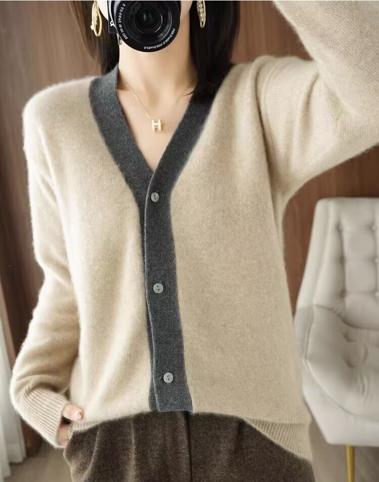 - 新品*カーディガン ニット セーター vネック レディース 配色 ニットカーディガン カシミヤ混 長袖 通勤 ニットトップス 上着*カーキ
