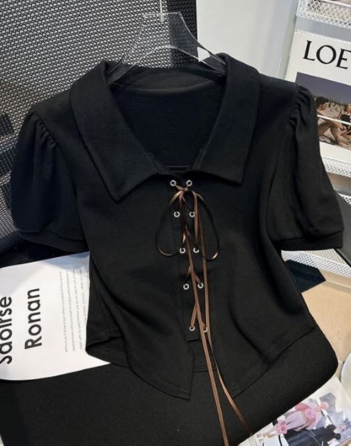 - 冰詩芙琳 黒 クロップド丈トップス レースアップ 半袖 Lサイズ