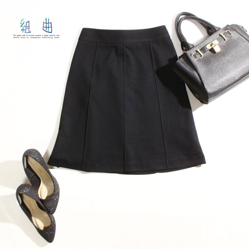 > 美品 組曲 クミキョク 株) オンワード樫山 秋 冬 毛55% Aライン ストレッチ ウールスカート 9号 2 ブラック 黒 通勤 ビジネス オフィス