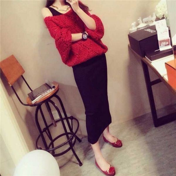 - 2点セット セットアップ セーター ワンピース 長袖 ロング M 赤 黒 ニット マキシ オフショル ゆるニット 新品 YLH242