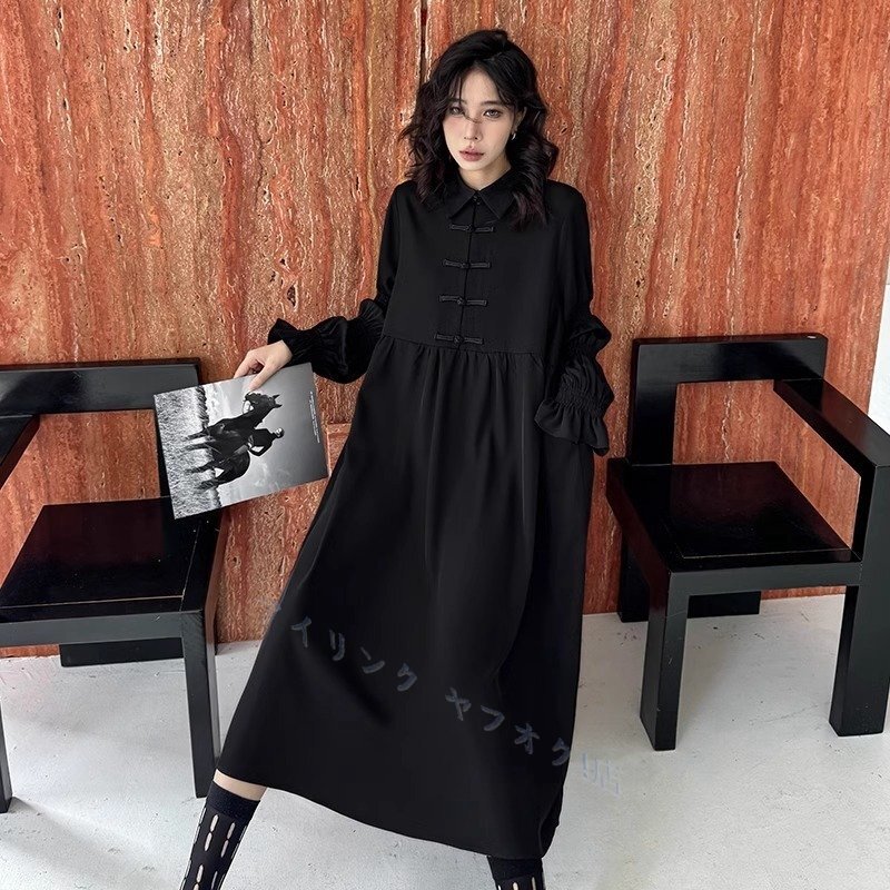 > ☆新品ワンピース レディース ロングワンピース ギャザーワンピース 長袖 無地 襟付き チャイナボタン 袖フリル L-4XL