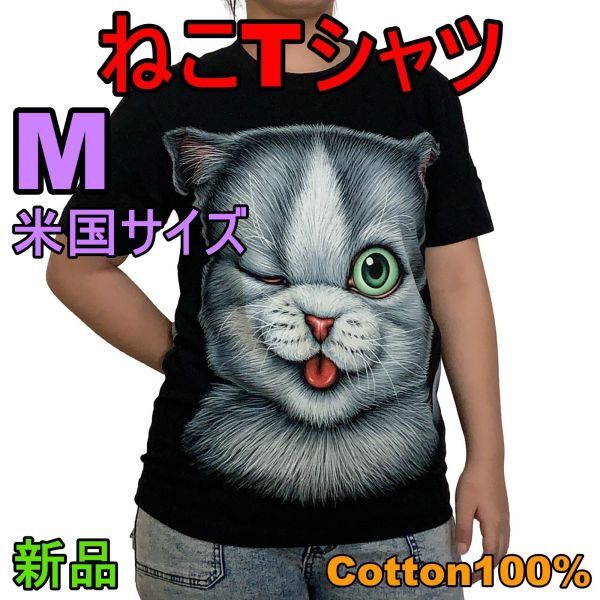 > 猫 半袖 Tシャツ (D01 M) 光る おもしろ ねこ バック プリント キャット アニマル シャツ