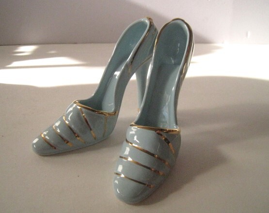 - 陶器の水色のハイヒール 金のアクセント オブジェ 飾り 小物入れ サイズ:約13.5×5×H11㎝/24N11.7-11