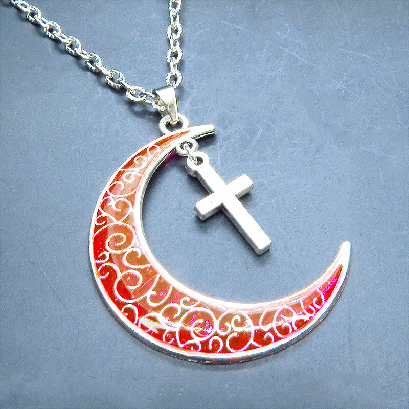 - アンティークシルバー アラベスク調の透かし模様のスカーレットカラーの三日月とロザリオのネックレス 長さ調整可