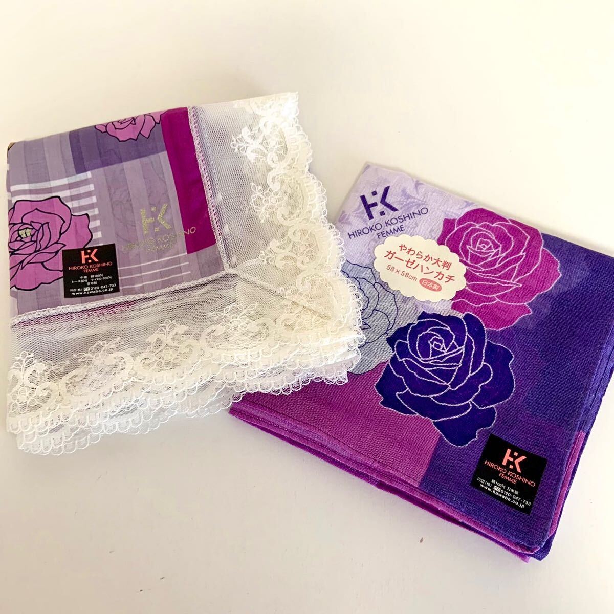 - 未使用 HIROKO KOSHINO ヒロココシノ 大判ハンカチ 2枚セット 花柄 パープル系 レース やわらかガーゼ 綿100% 日本製 ハンカチ 川辺(株)