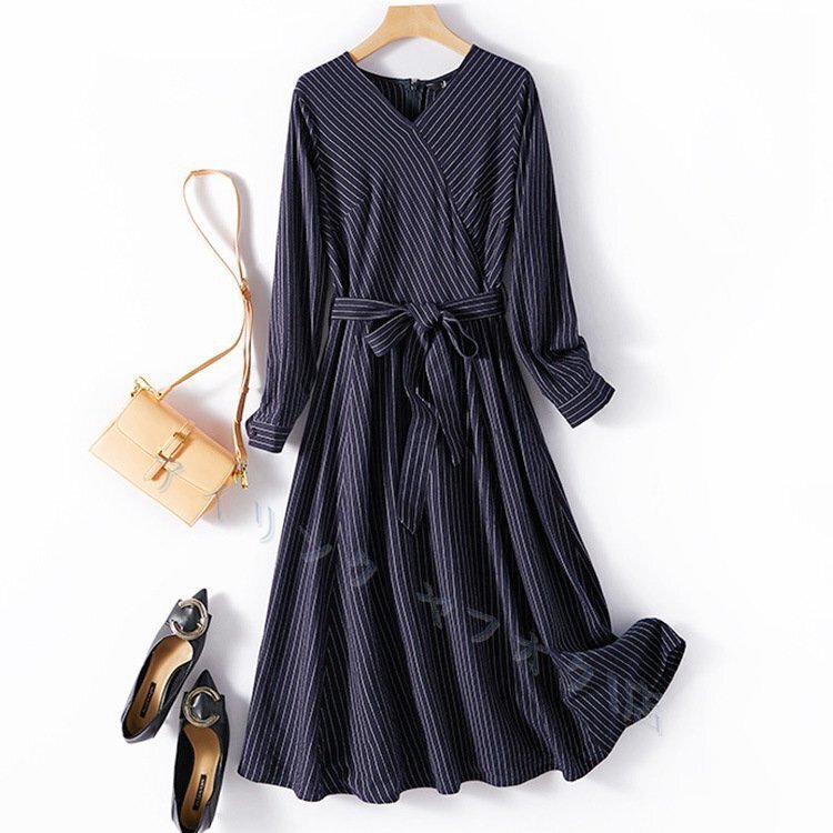 - 新品上品な印象 ワンピース ロングワンピース レディース Vネック 体型カバー 女性 おしゃれ ストライプ 着痩せ ウエストリボン付き M