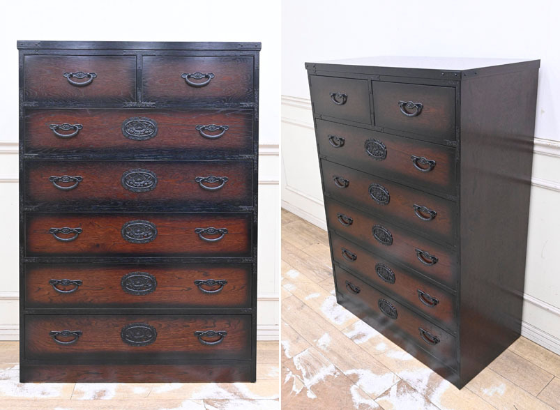 - KW06 民芸家具 欅 けやき木目 金具 時代箪笥 チェスト 整理タンス 帳場箪笥 重厚金具 庄内箪笥 仙台タンス ハイチェスト