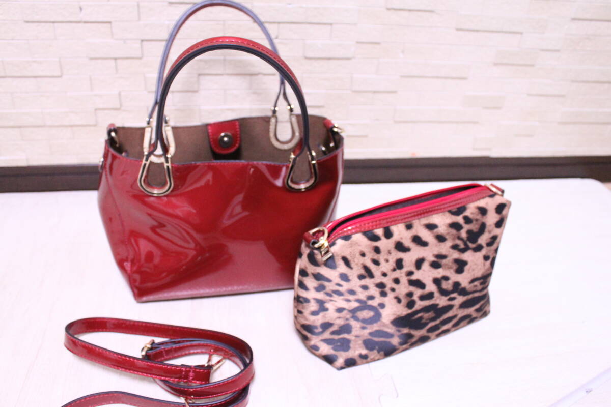 - 美品 レディス エナメル バッグ 肩掛けヒモ付き 赤バッグ ポーチ ショルダーストラップ付バッグ ワインレッド