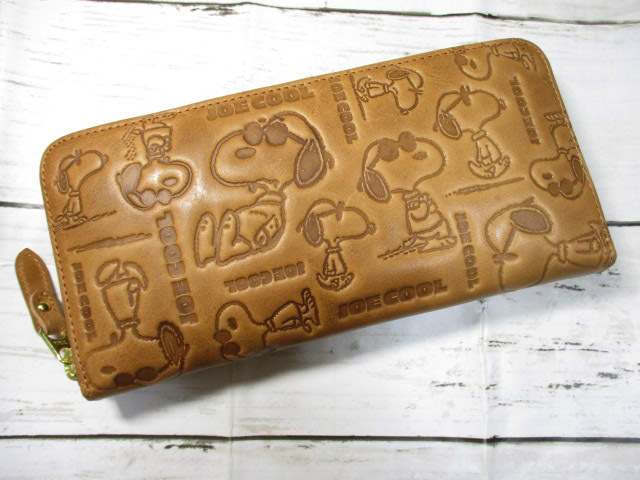 - 新品 スヌーピー 財布 メンズ レディース 長財布 ラウンド SNOOPY 本革 牛革 JOE COOL モノグラム 可愛いデザイン キャメル