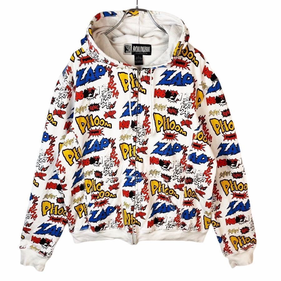 - Social Collisionジップパーカーフーディ総柄プリント英文字マルチカラー白ホワイト黄色イエロー青ブルー赤レッド裏地パイルvintage40916
