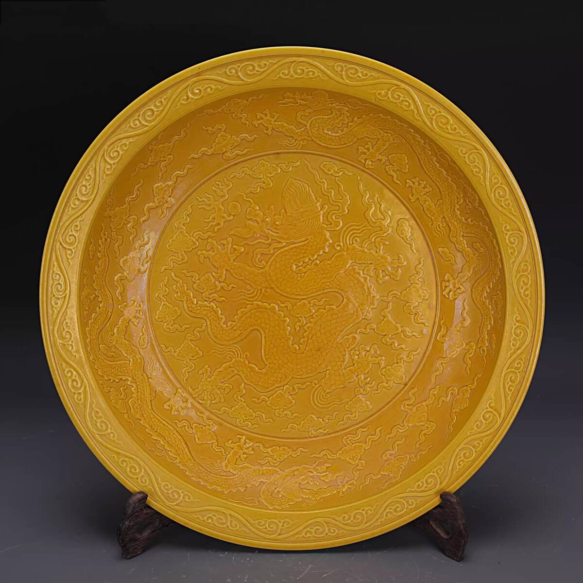 - ◆旧家蔵出◆ 古美術 中国古玩 大明永樂年施 黄釉 雕刻 五龍紋大盤 擺件 古賞物 骨董 時代物 CN01
