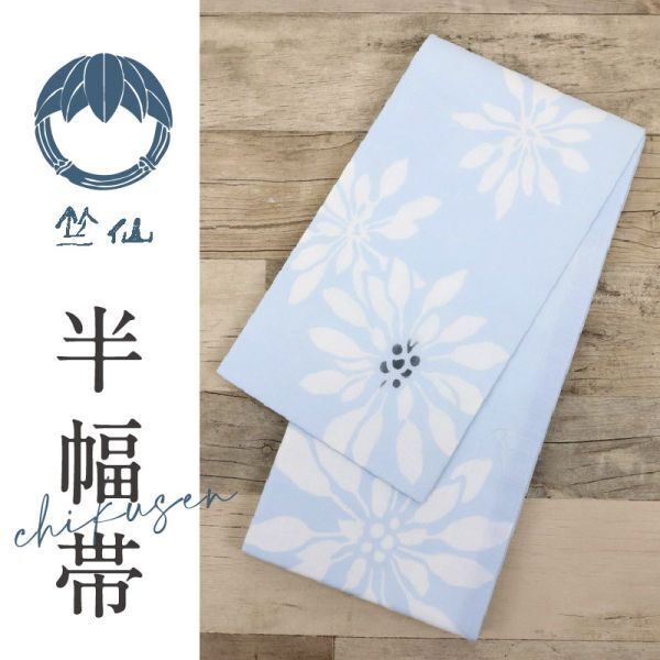 - 【半幅帯】 『竺仙鑑製』 水色 涼やか花模様 木綿 注染 小袋帯 着物 BA3-3